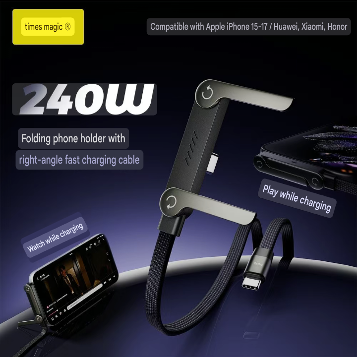 The BeiMo 240W Fast Charging Cable combines a high-speed braided charging cable, a convenient 90° angled connector, and a built-in foldable phone stand.